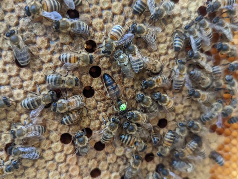 Gefüttert wird die Königin von den Arbeiterinnen, die auch für's Putzen, Pflege der Maden, Sammeln von Nektar, Pollen und Wasser oder die Bewachung des Bienenstock zuständig sind. Diese Aufgaben durchläuft jede Biene in ihrem kurzen Leben von knapp fünf Wochen.